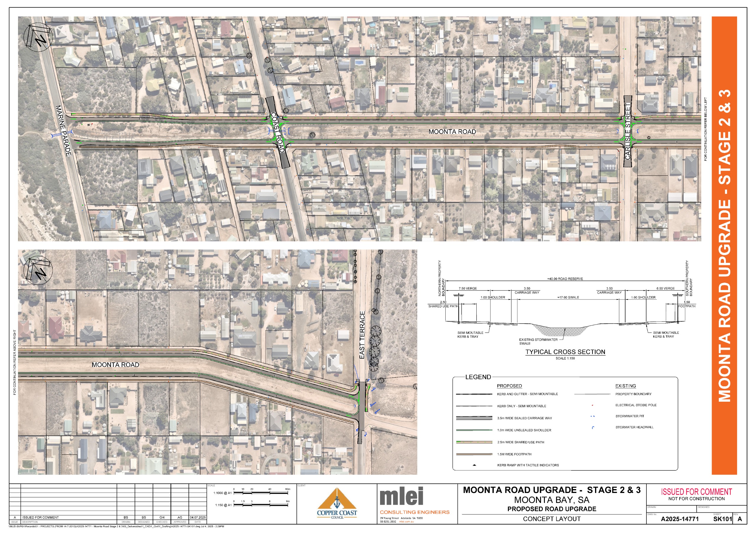 Council has awarded the next two stages of Moonta Road (East Terrace to Marine Parade) to MLEI Consulting Engineers. Council has worked with with MLEI on the creation of a preliminary design (SEE BELOW) - this design has been put to the residents of Moonta Road for consultation in the form of a survey. This survey has now closed and the feedback is being reviewed.