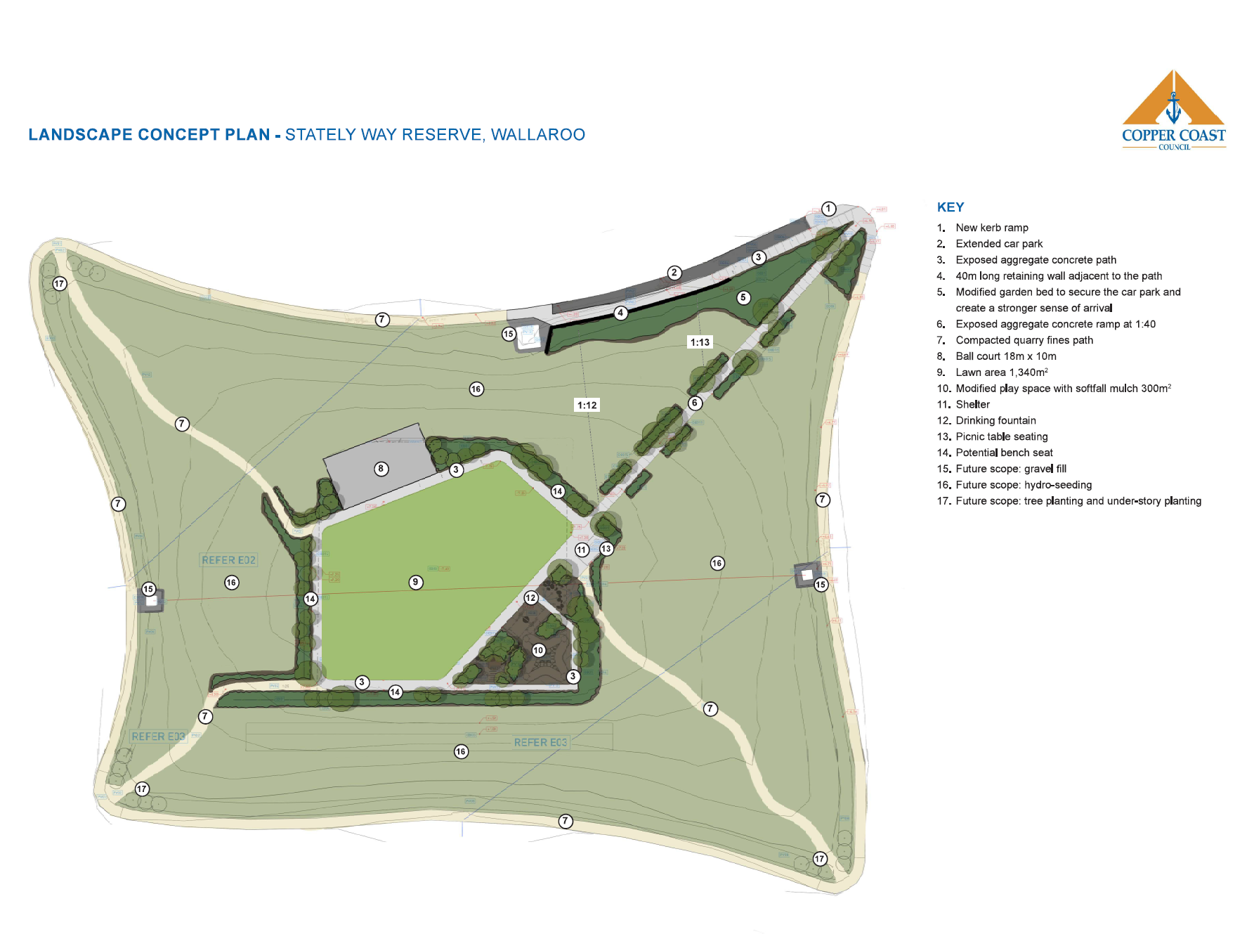 The landscape concept plan highlights a comprehensive upgrade to the area, featuring an extended car park to accommodate increased visitor demand, new concrete pathways to enhance accessibility and connectivity throughout the site, and a strategically placed drinking fountain for public convenience. The design also incorporates comfortable bench seating and a modern shelter to provide shaded rest areas for users. In addition, the plan introduces a proposed multi-sport court, creating a versatile recreation space that encourages a range of community sporting activities and promotes active lifestyles.